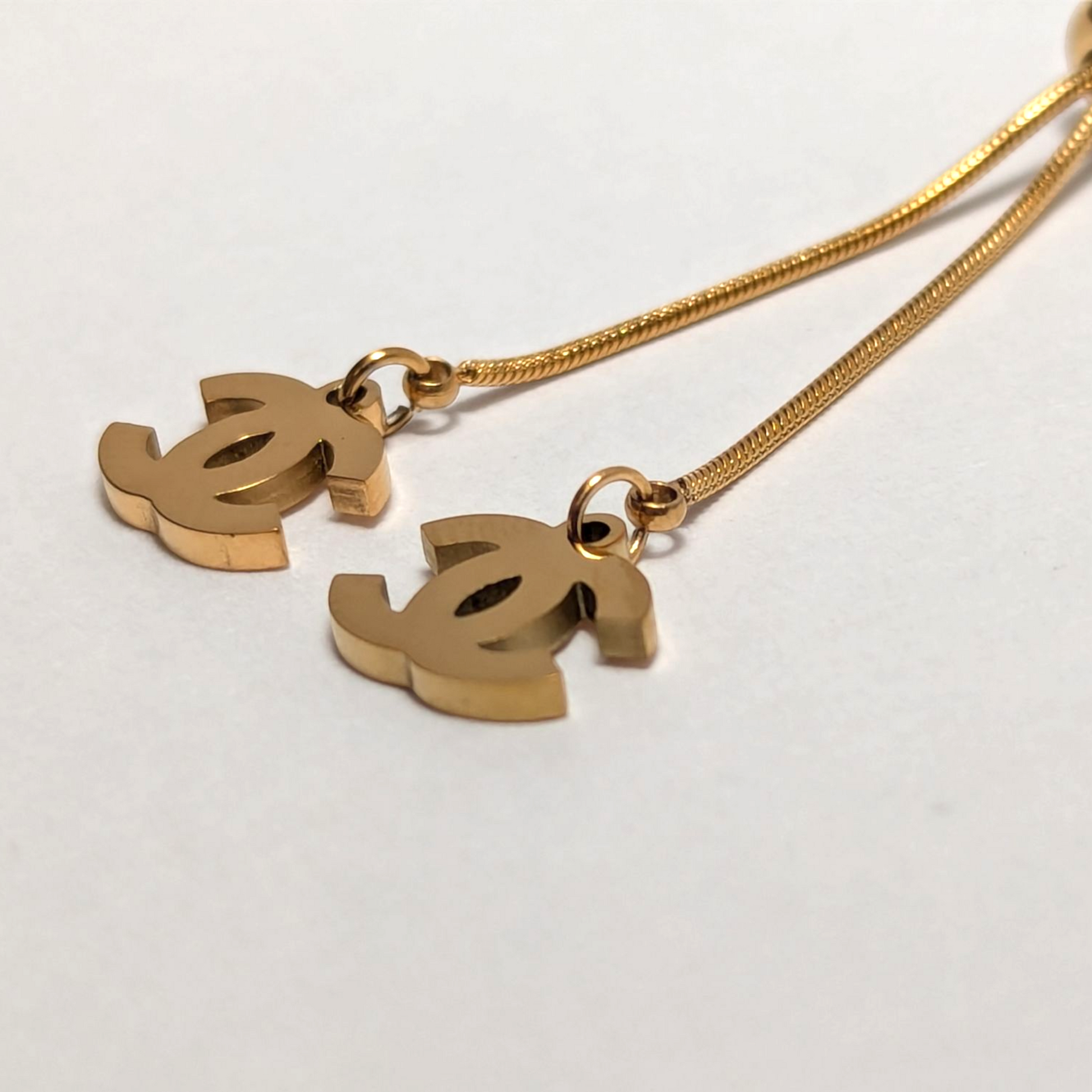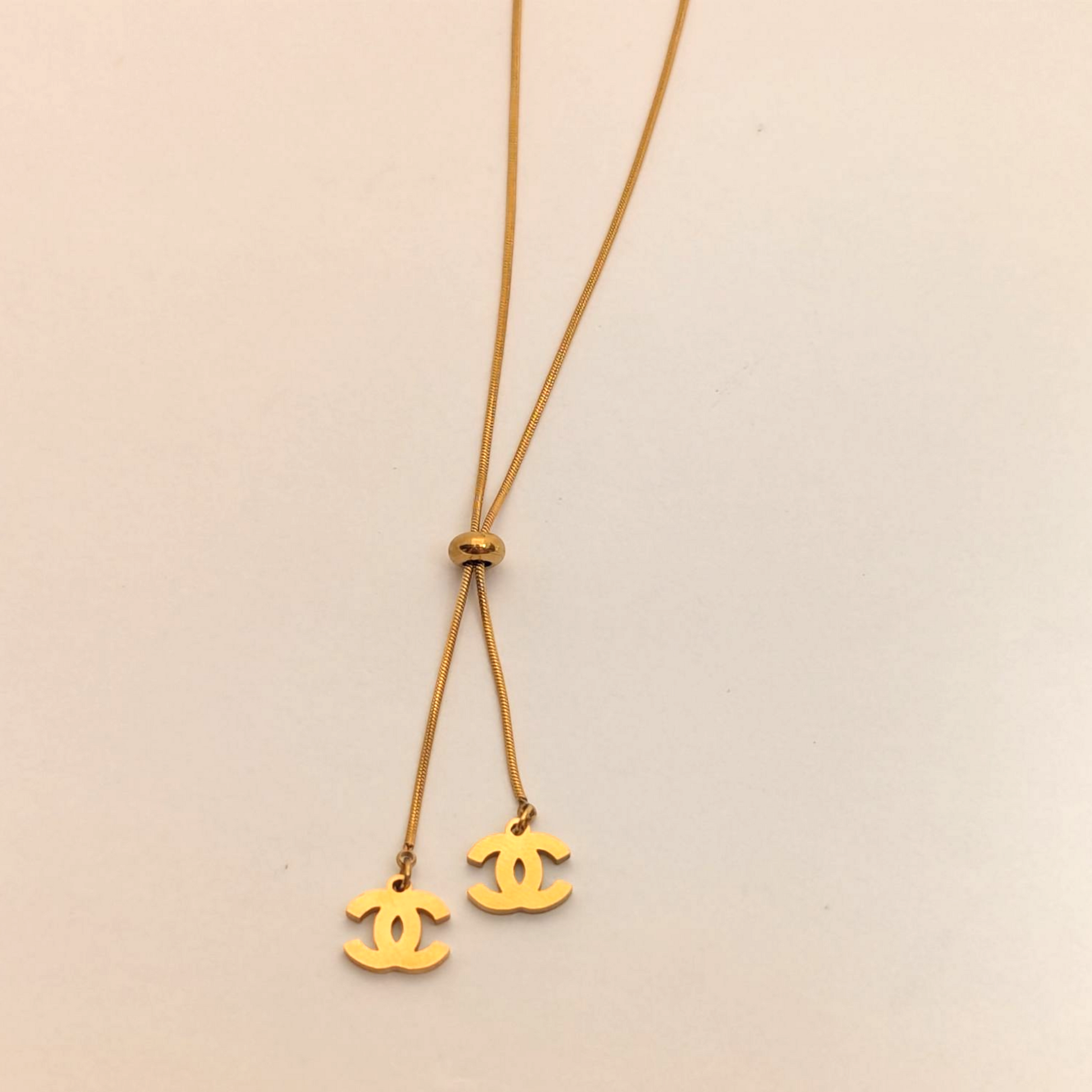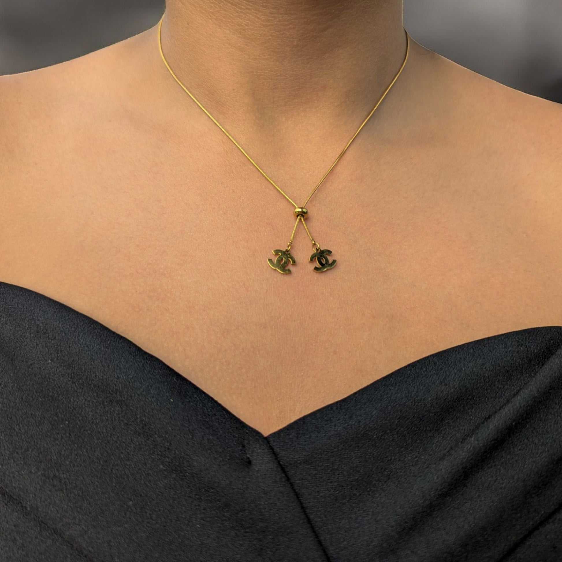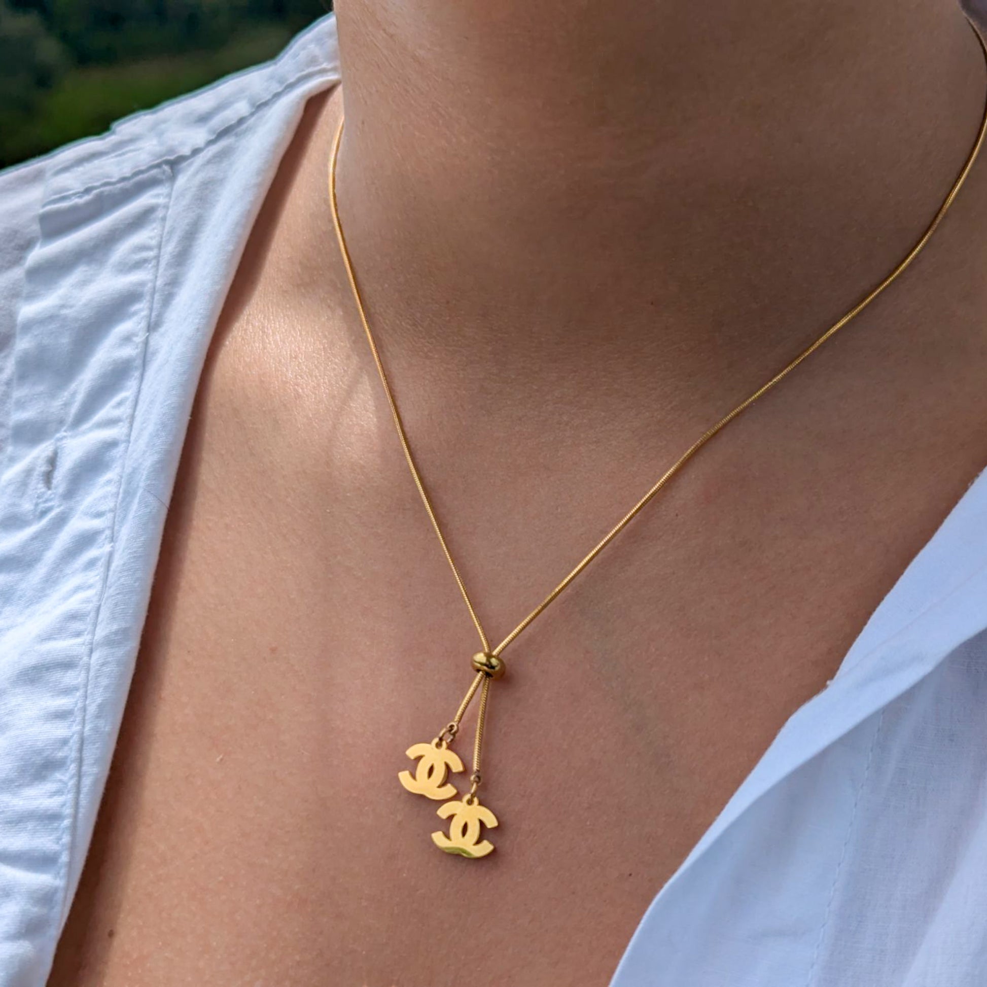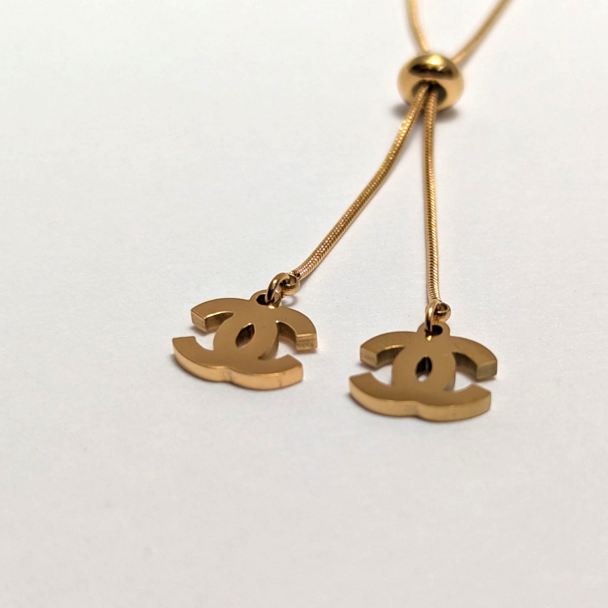Cadena lariat en oro laminado 18k con doble colgante CH. Brillo sofisticado y diseño minimalista para un look moderno y distintivo.