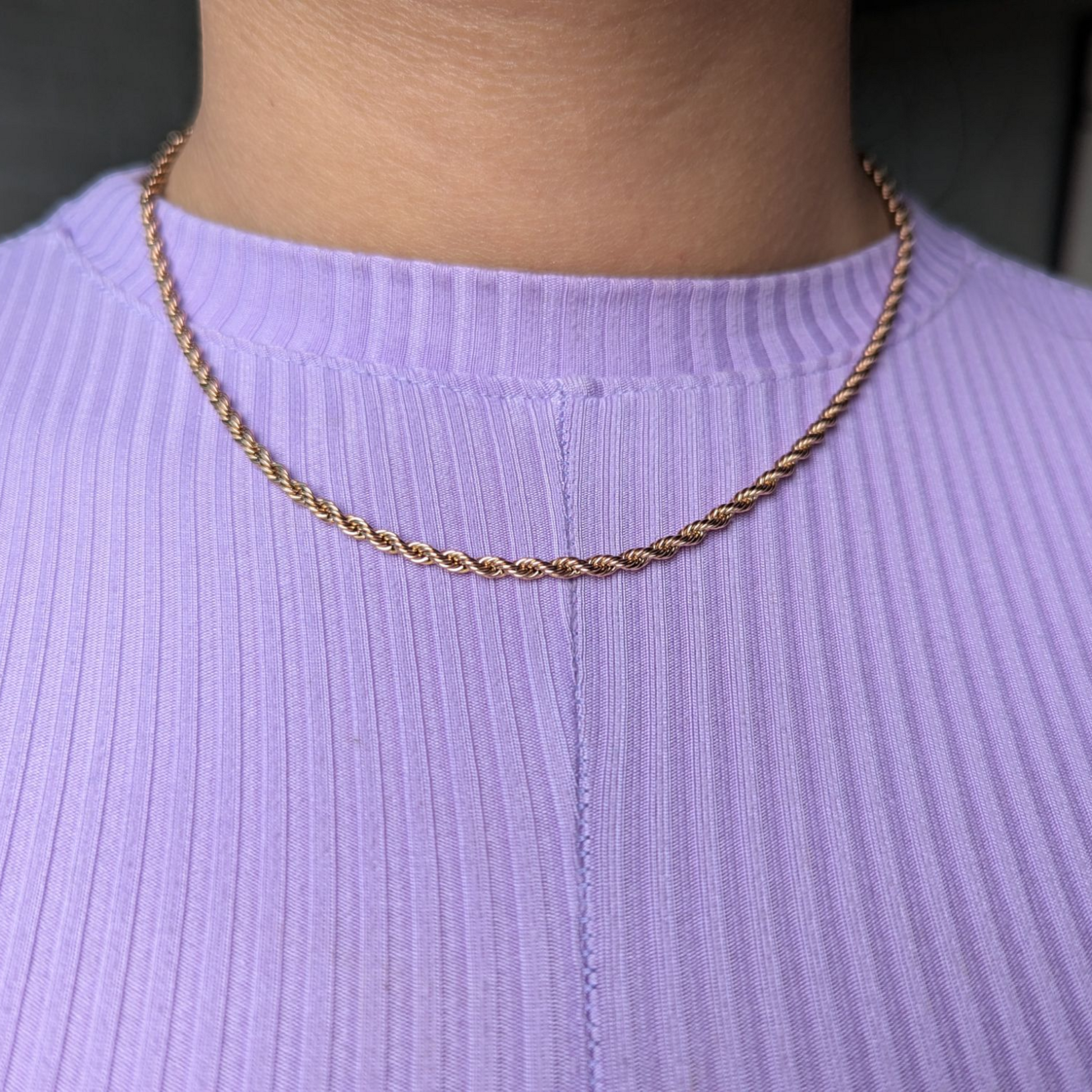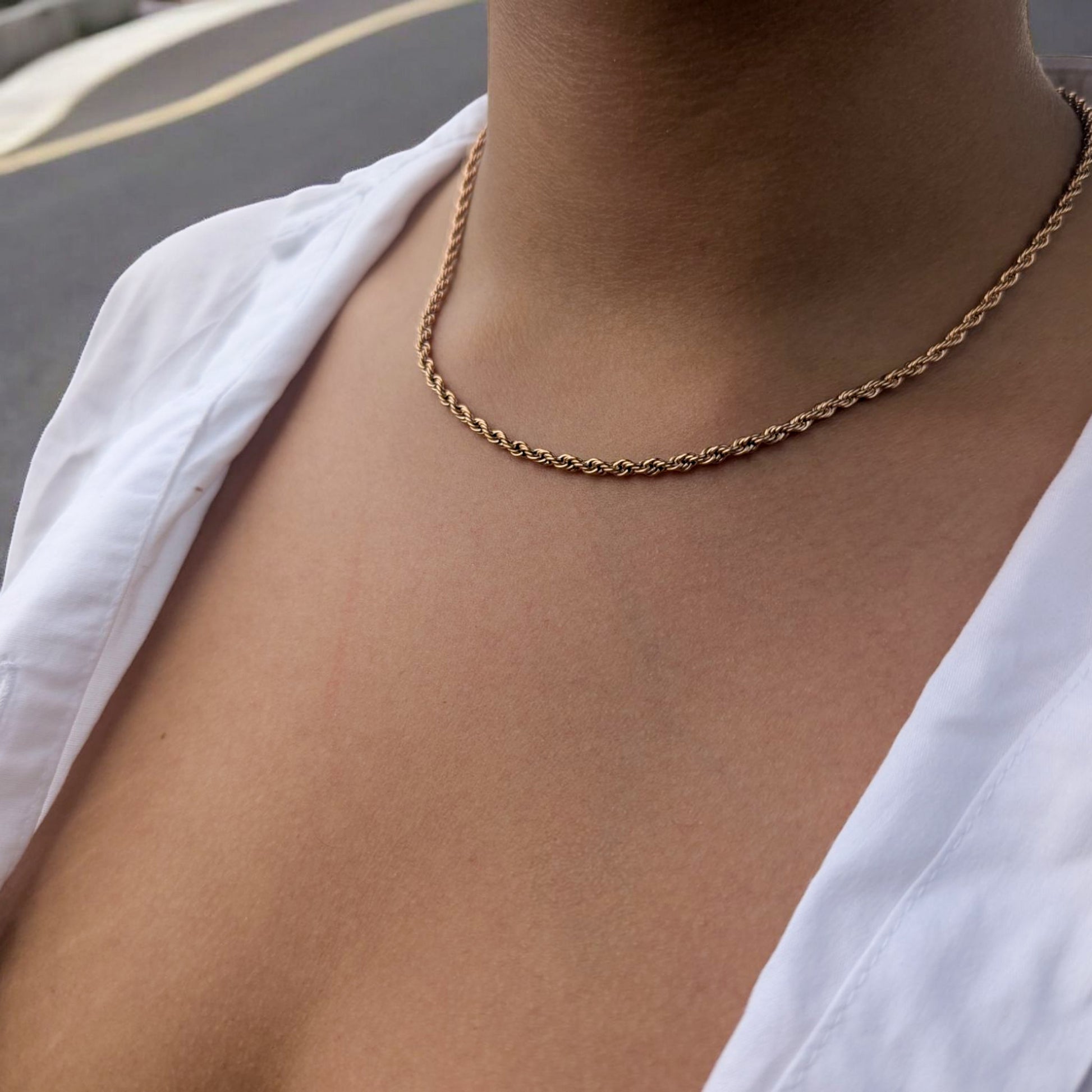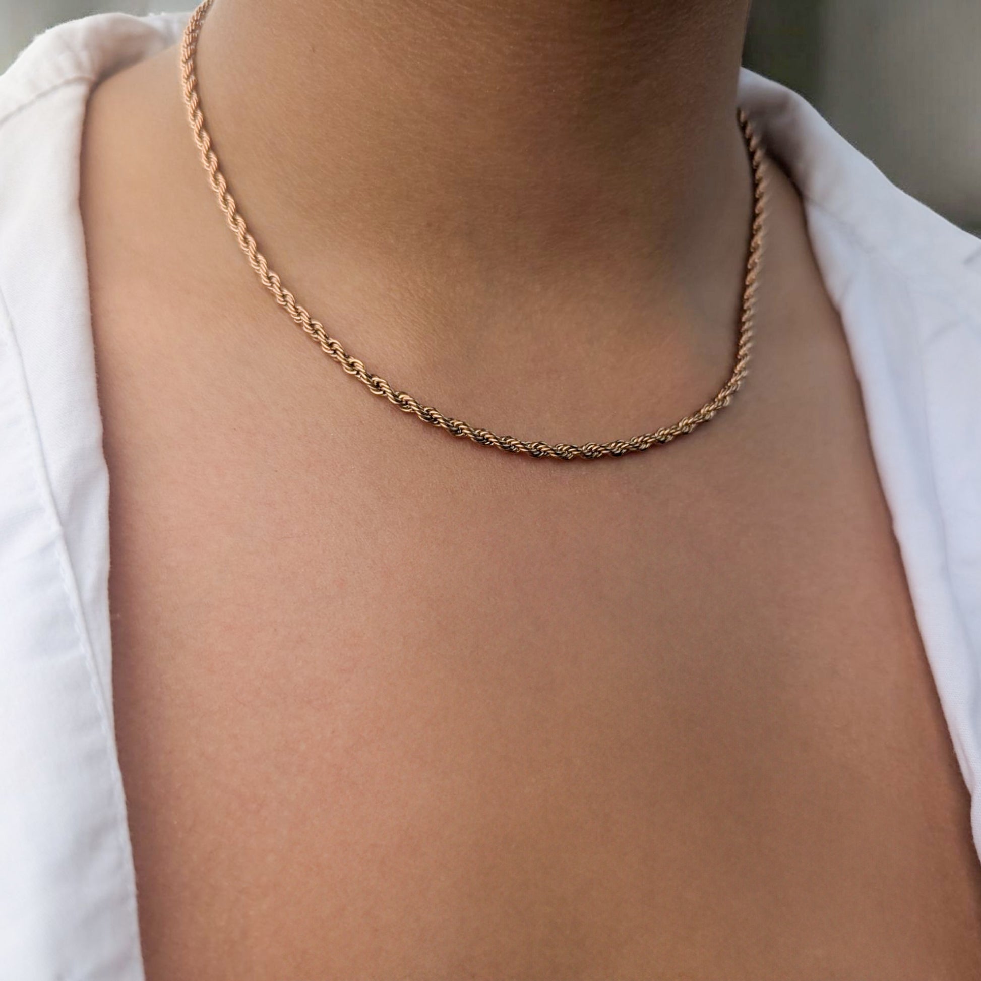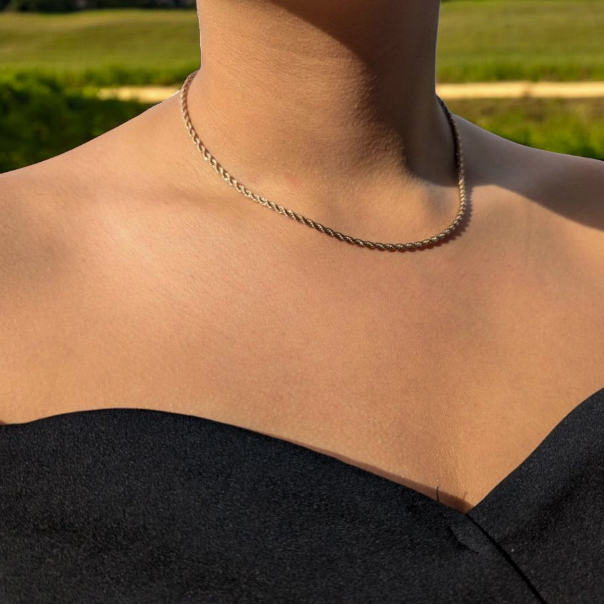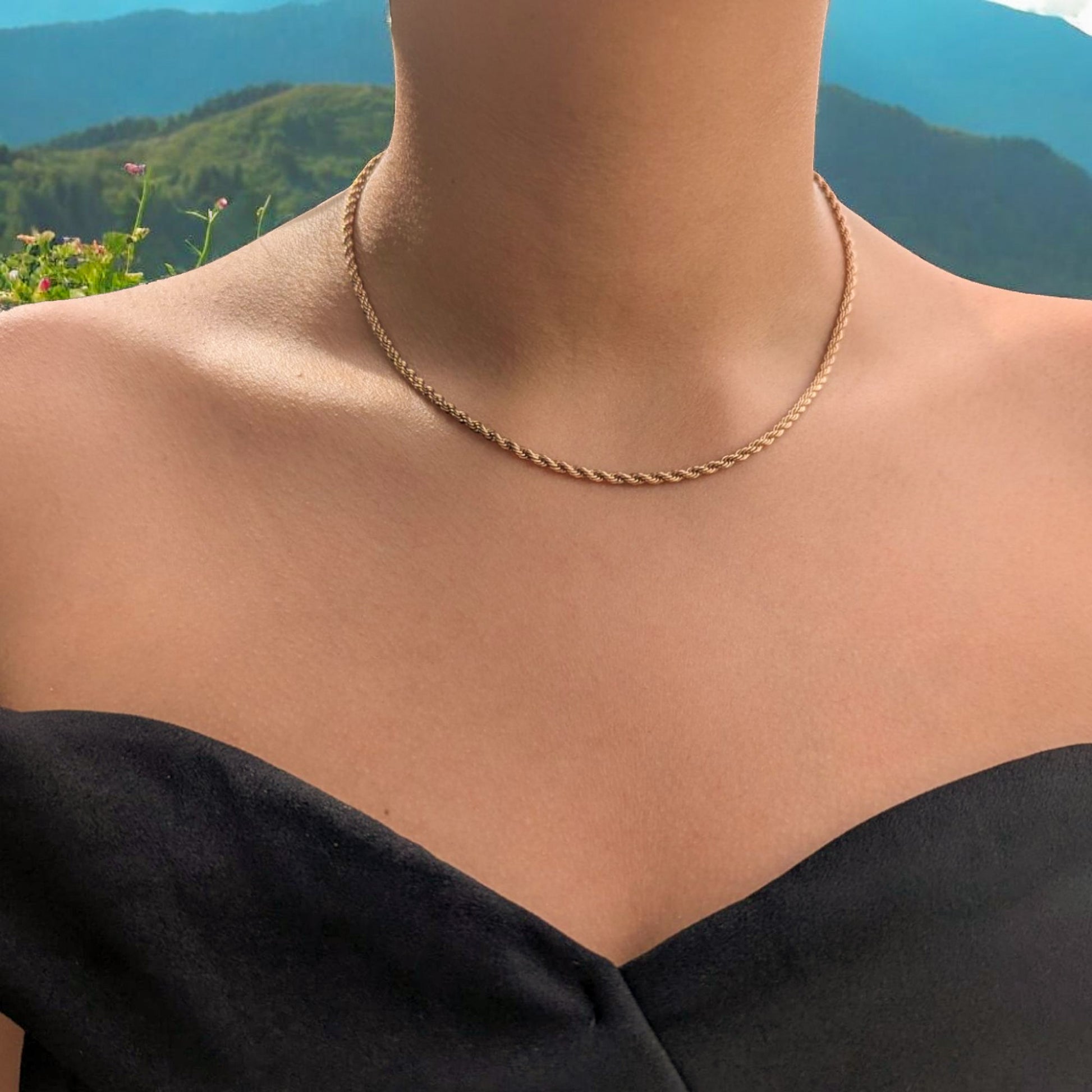 Cadena delicadamente trenzada en oro laminado de 18K, con un brillo sutil en tono rosa que realza el cuello con elegancia. Su diseño minimalista y femenino la hace ideal para lucir sola o acompañada de un dije discreto. Un básico refinado para tu colección de joyas.