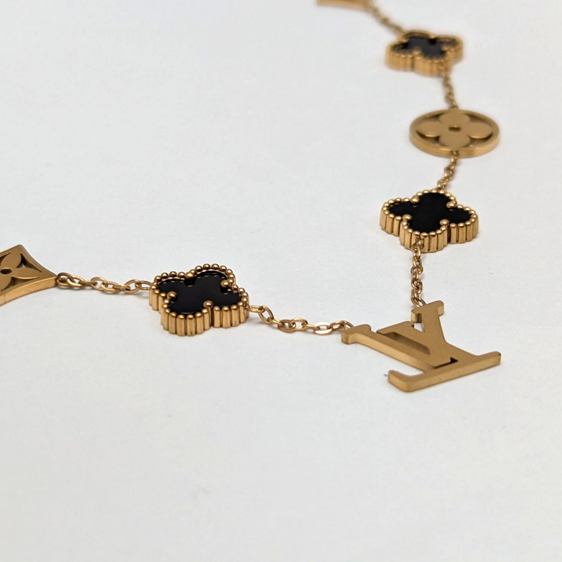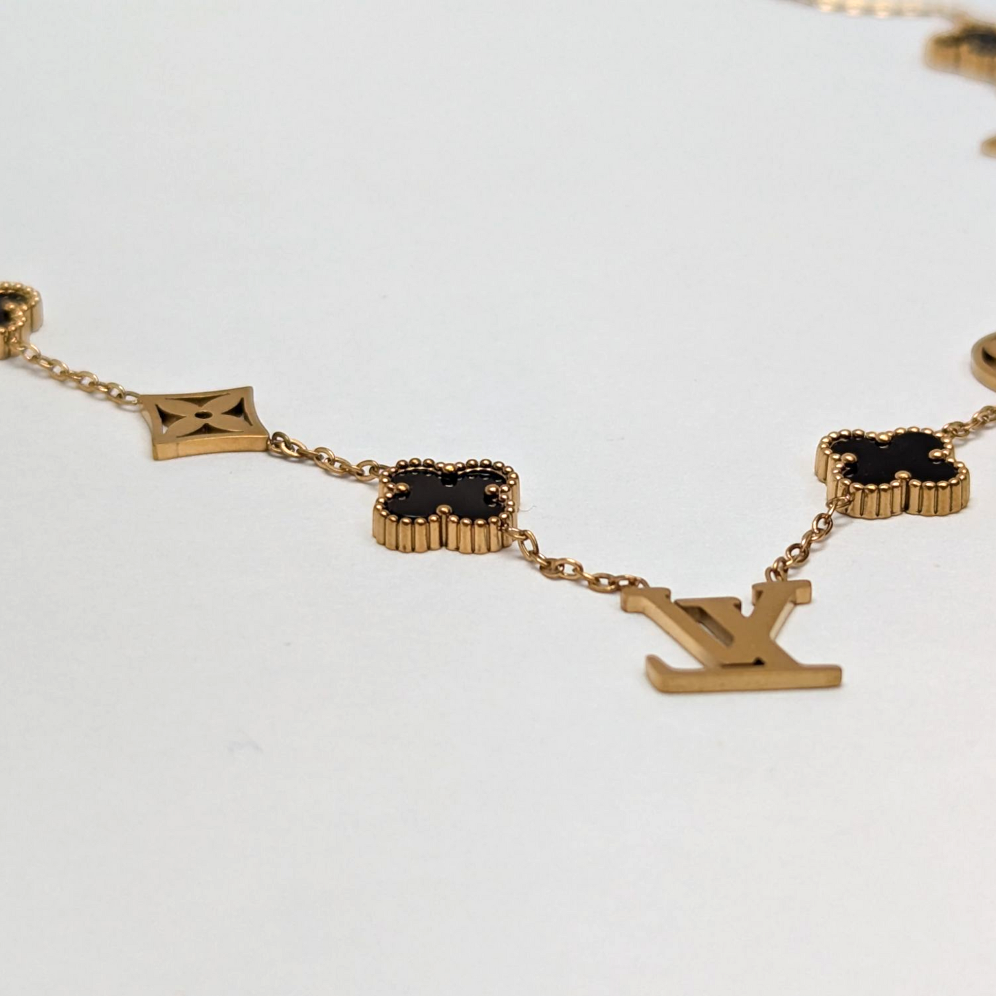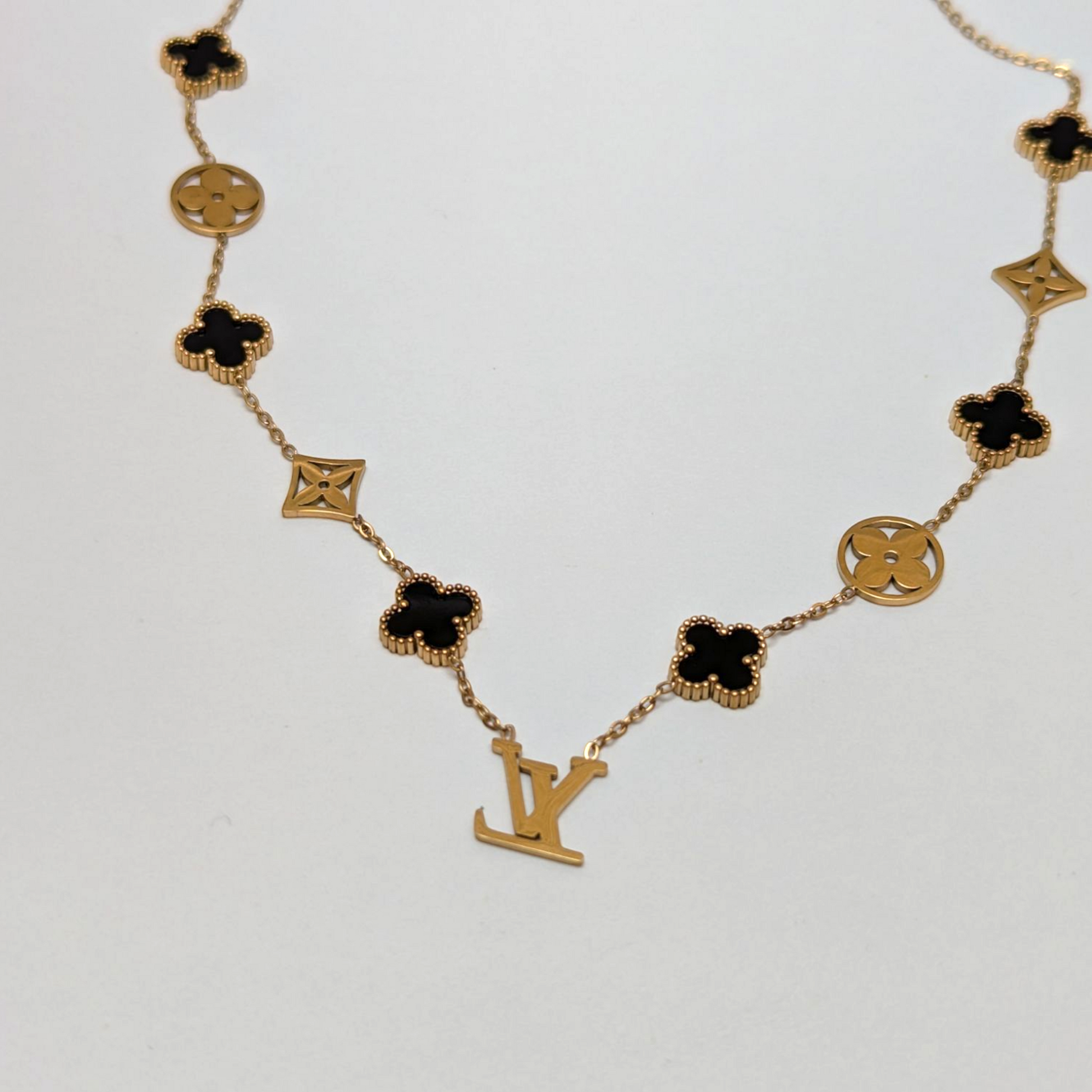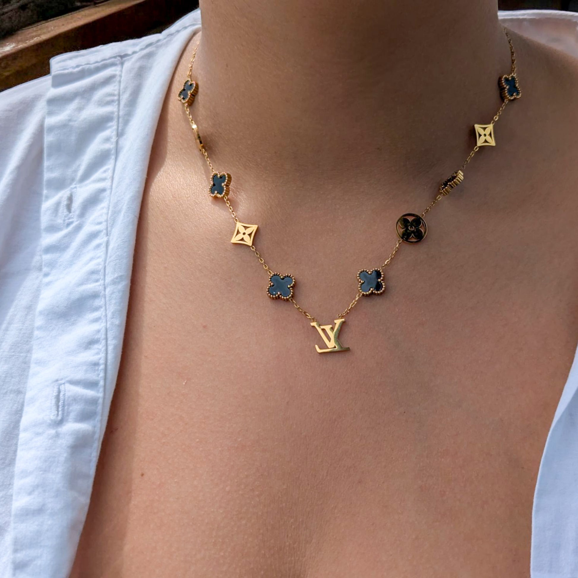 Cadena Trébol LV en oro laminado 18k. Diseño elegante y femenino con detalles icónicos, ideal para destacar con estilo propio en cualquier ocasión.