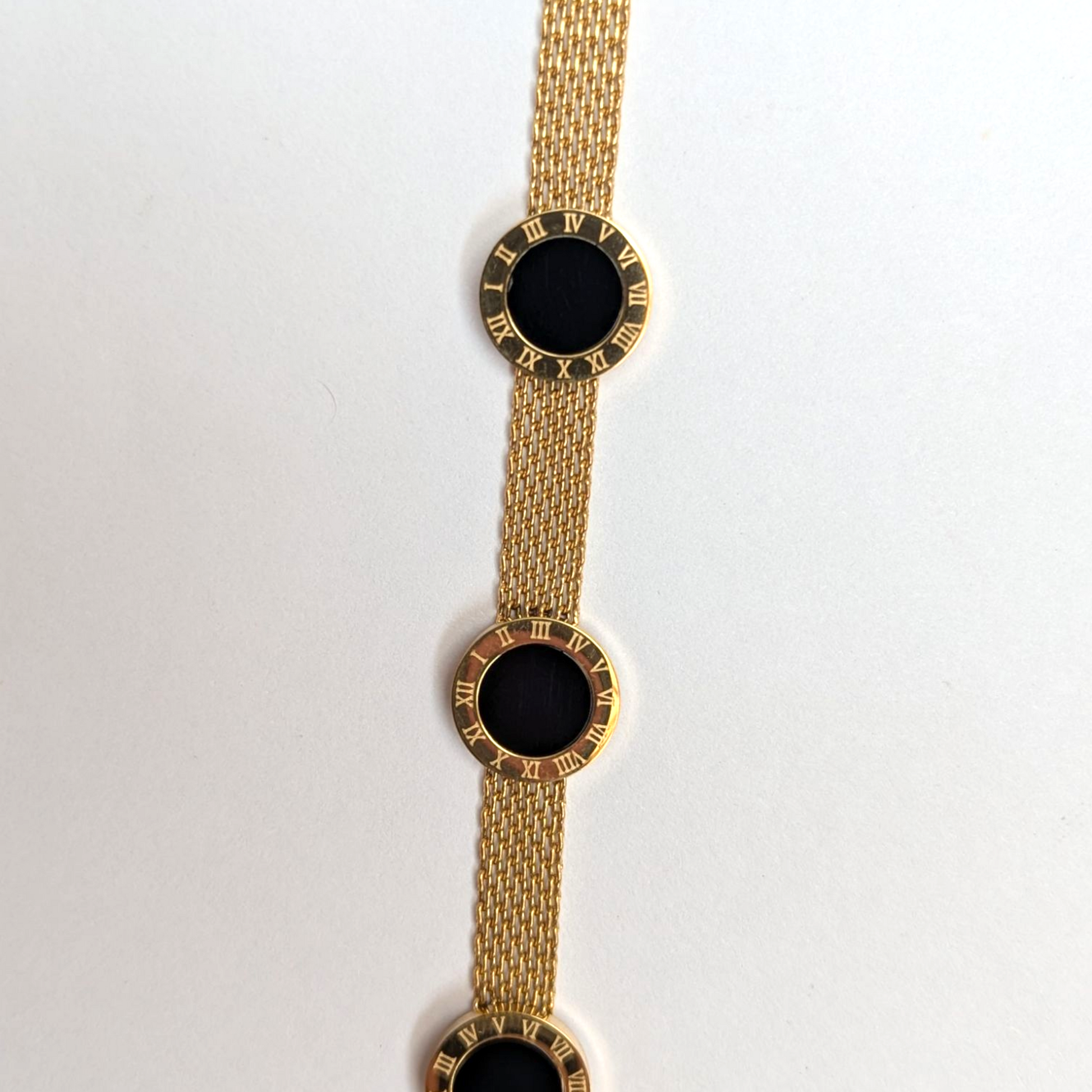 Pulsera tipo malla en oro laminado 18k, con discos negros y números romanos grabados. Un diseño refinado que combina elegancia moderna y estilo distintivo.